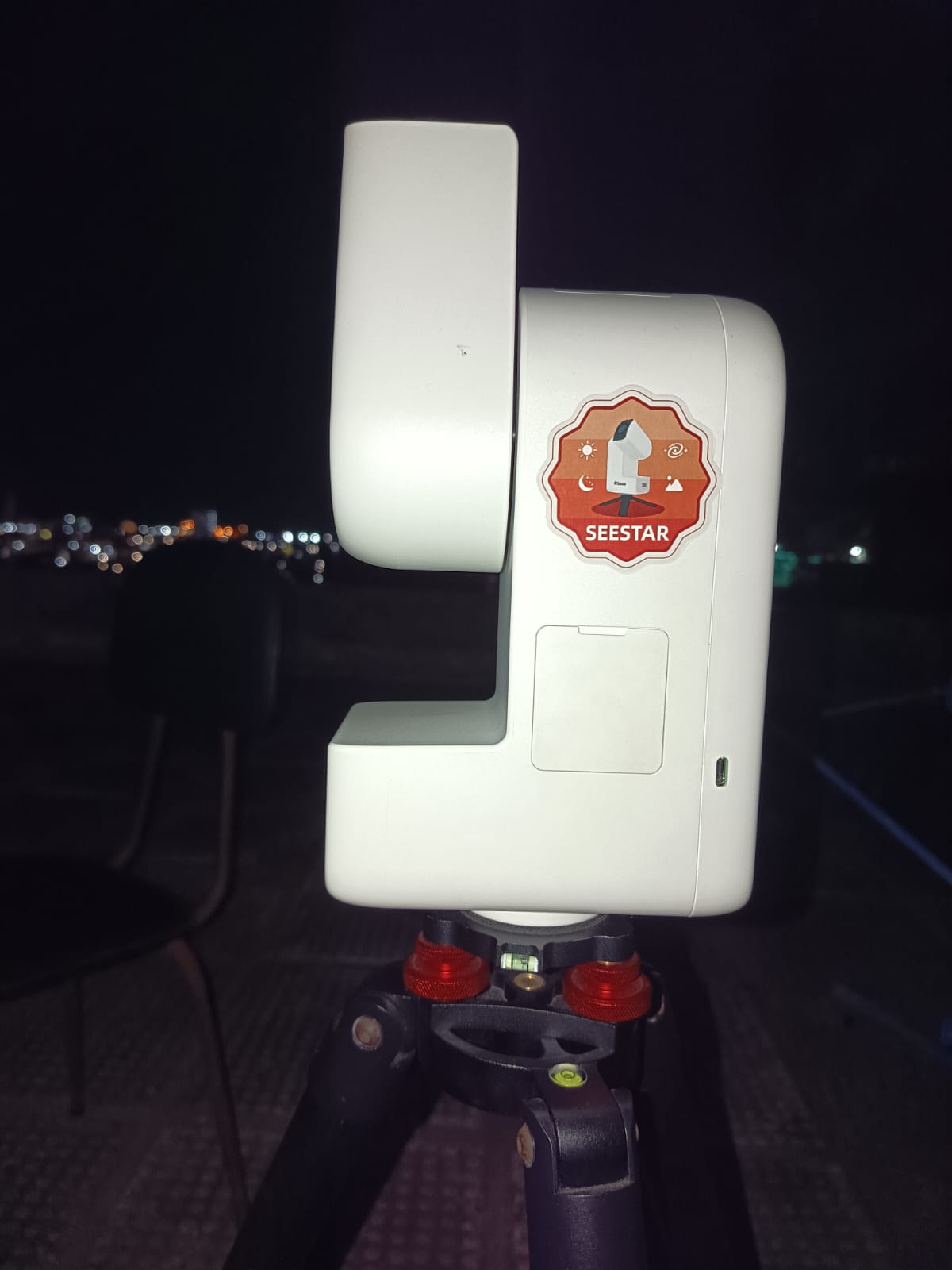 Seestar S30 apontado para o céu. Foto de Romualdo Caldas.