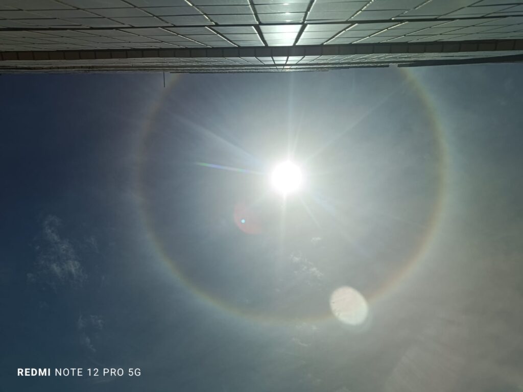 Mas a manhã reservava um presente especial. Durante os preparativos, Romualdo, alertado por Wellison, registrou, com seu dispositivo celular, um belíssimo Halo solar, fenômeno óptico que se forma pela refração da luz em cristais de gelo na alta atmosfera. A imagem, capturada em nossa sede, rapidamente mobilizou a rede de associados do CEAAL: de diversos pontos de Maceió, outros sócios (Wellison Silva, Fábio Leucas, Andresa Barbosa) também registraram o mesmo fenômeno, compartilhando seus olhares e ângulos únicos sobre o evento.