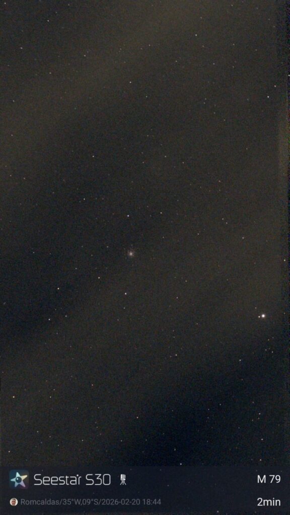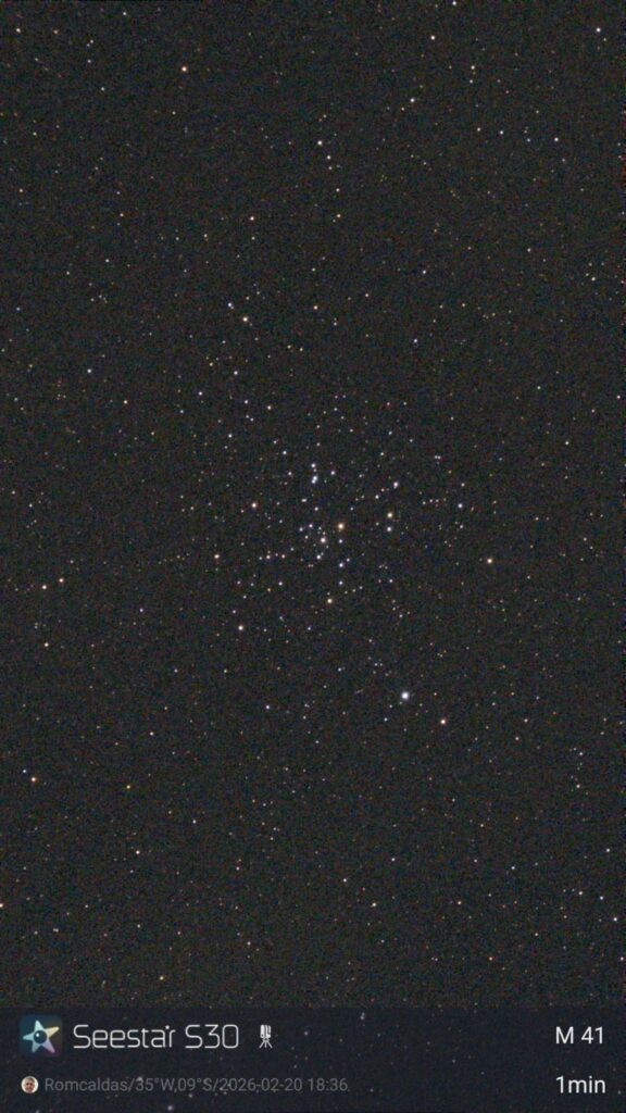 Com determinação e espírito de equipe, armamos nossos equipamentos e, entre uma conversa e outra sobre ciência e superação, conseguimos registrar imagens impressionantes utilizando o Seestar S30. A noite nos presenteou com a captura de objetos celestes de rara beleza, como o aglomerado globular M79, o aglomerado aberto M41, a avermelhada e fascinante estrela R Doradus (também conhecida como P Doradus) e a espetacular nebulosa NGC 2070, localizada na Grande Nuvem de Magalhães.
