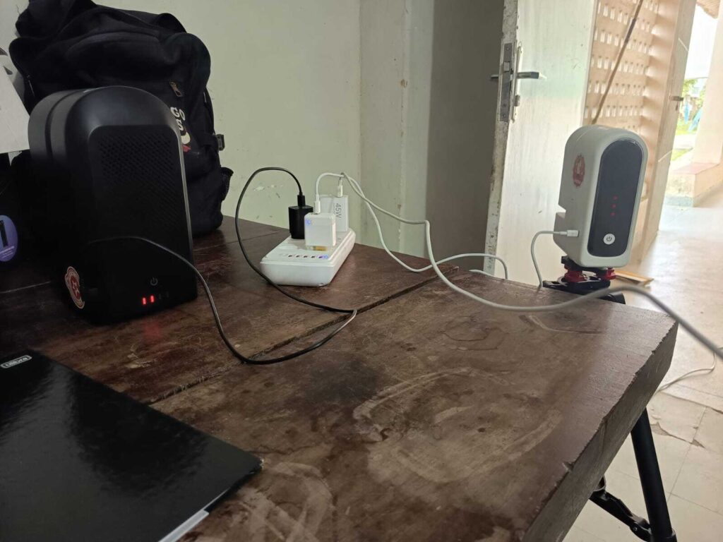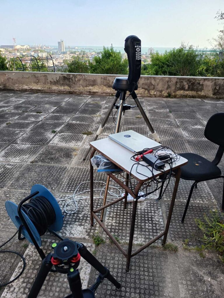 Em seguida, a atenção voltou-se para o parque tecnológico da associação. Foram carregadas as baterias dos telescópios robóticos Seestar S50 Darimann e S30, preparando-os para as próximas sessões noturnas, após a tentativa frustrada pela ventania na noite anterior.