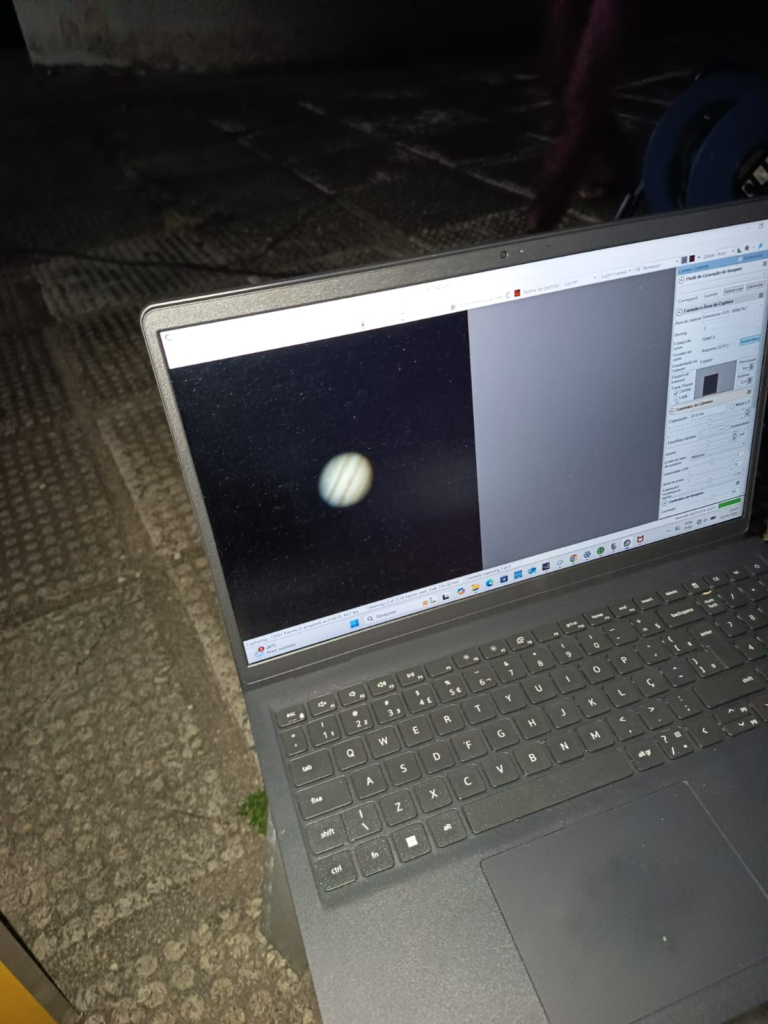 · O gigante gasoso Júpiter, brilhando no céu. A observação foi ainda mais enriquecida com o uso de telescópios tradicionais e de telescópios acoplados a câmeras, que capturavam imagens em tempo real do planeta, permitindo uma visualização única e detalhada.