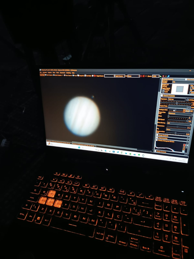 Sem se deixar abater, o grupo partiu para a observação direta. Enquanto isso, os sócios Péricles Terto, Igor Cavalcante e Carlos Vasconcelos voltaram-se para telescópios com montagens automatizadas (GoTo), que permitem localizar objetos com precisão. O alvo principal da noite foi o gigante gasoso do nosso Sistema Solar: Júpiter.