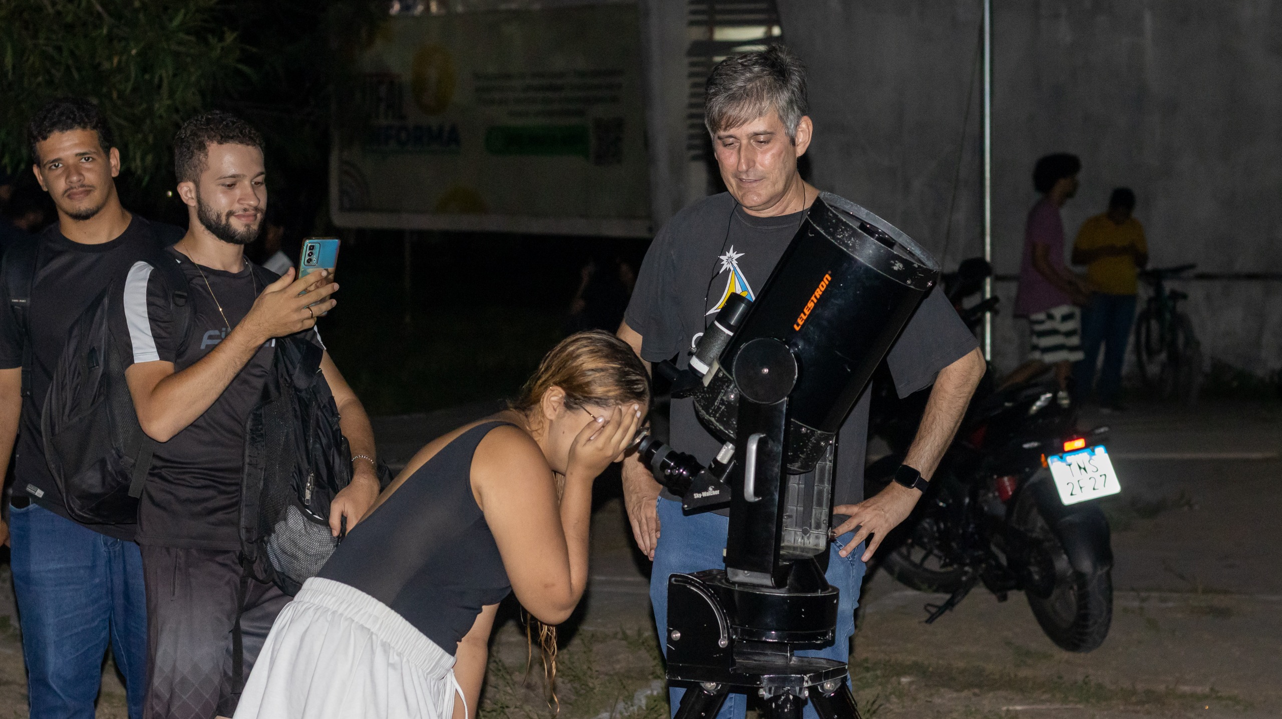 Chegamos ao campus da UFAL às 17:35 e iniciamos a montagem dos equipamentos e, às 18:00 estávamos prontos com três telescópios, sendo um do CEAAL. Ficamos na entrada do restaurante universitário e centenas de alunos observaram conosco a Lua e Júpiter de início com seus 4 satélites galileanos e depois com 3 apenas, visto que Io entrou em trânsito pelo disco de Júpiter.